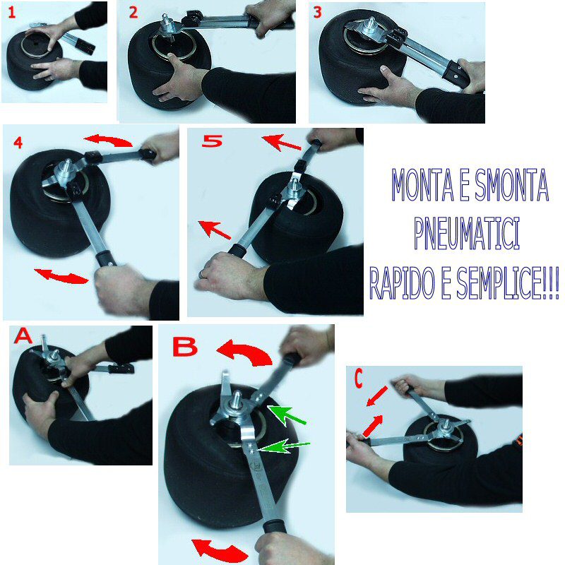 Grazie a questo attrezzo il montaggio e lo smontaggio dei pneumatici sarà una sciocchezza. L’utilizzo è semplicissimo. L’attrezzo và utilizzato dopo aver “stallonato” il pneumatico dal cerchio operazione eseguibile con i vari smontagomme (bk094 oppure bk095). Seguiamo le varie fasi in figura per lo smontaggio . Fig. 1-inserire il blocco di centraggio nel cerchio- Fig. 2- inserire le due punte dell’attrezzo come si fa con le normali leve smontagomme- Fig 3 – con le punte inserte nel pneumatico agganciare il perno centrale dell’attrezzo nel foro del blocco di centraggio Fig- 4 e Fig. 5 fare ruotare le due leve aprendo l’attrezzo sino alla totale apertura e alla totale fuoriuscita del pneumatico. Passiamo ora alla fase di MONTAGGIO. Fig A sempre con il blocco di centraggio all’interno del cerchio appoggiamo l’attrezzo dal lato opposto (con le due leve dello smontaggio che vanno verso l’alto) e innestiamo i due blocchetti guida meglio rappresentati dalle due frecce verdi in fig. B e portiamo il perno centrale ad agganciare il blocco di centraggio come fatto precedentemente dal lato opposto. Fig. B e Fig C- facciamo ruotare lo strumento che così consentirà ai due blocchetti guida di far inserire il pneumatico nel cerchio. Utilizzabile anche con i cerchi tradizionali con attacco diretto al fusello…in questo caso non si utilizzerà l’anello di centraggio (plastica nero) interno ma l’attacco del cerchio sarà la sede del perno dell’attrezzo.