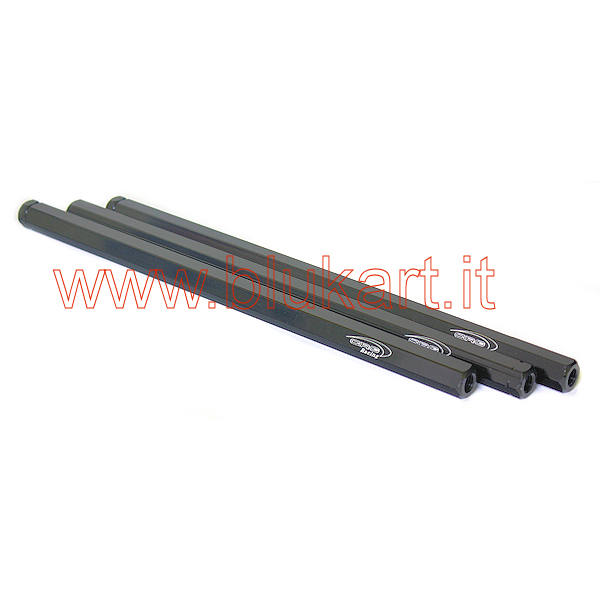 Tirante anodizzato m8 a sezione esagonale originale CRG. I tiranti sterzo hanno un lato con filettatura normale (destra) e l’altro con filettatura sinistra. Questo consente una regolazione micrometrica della convergenza. Occorre dotare quindi il tirante di uno snodo destro ed uno sinistro (bk329-330) e dei rispettivi dadi per il bloccaggio bk355-356 (contro-dado).